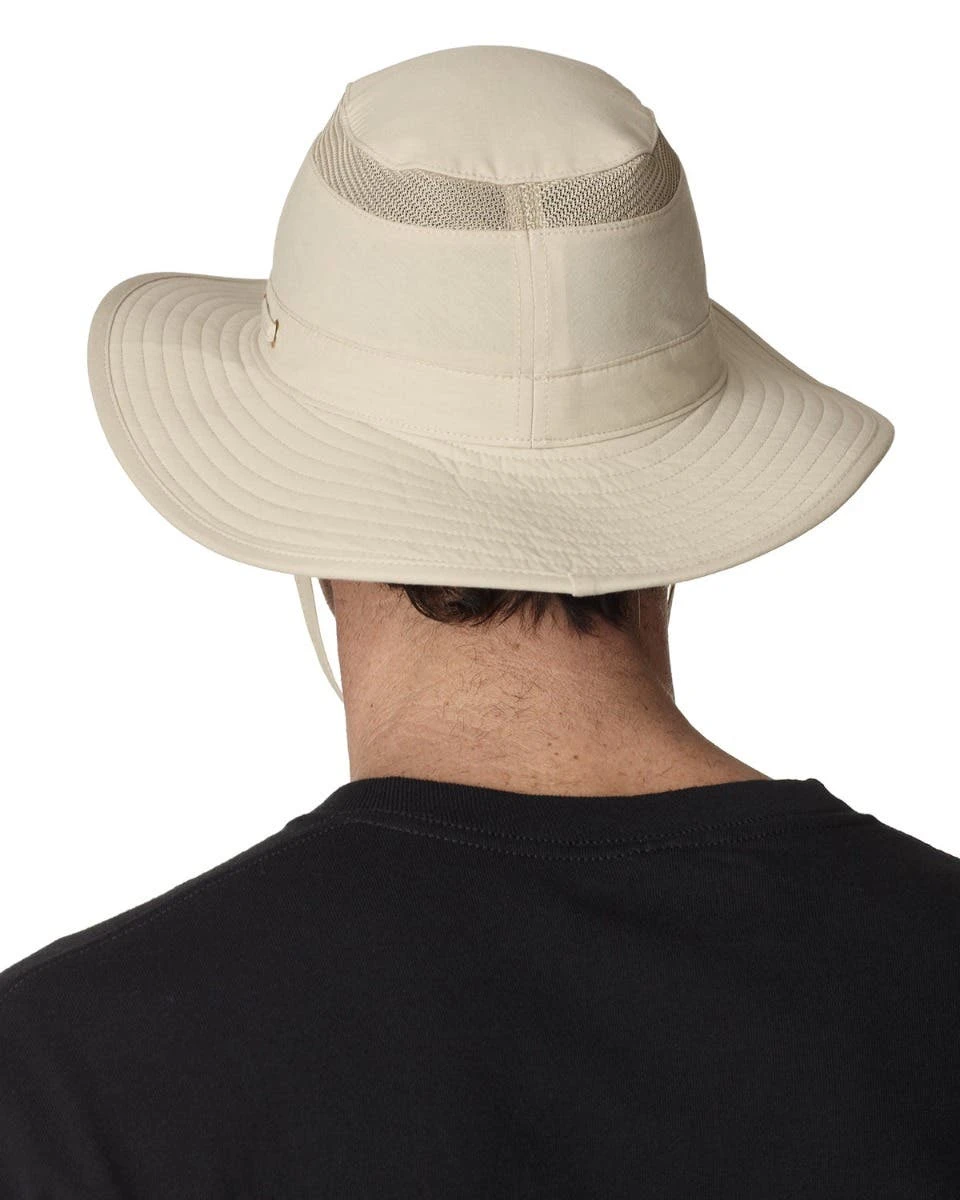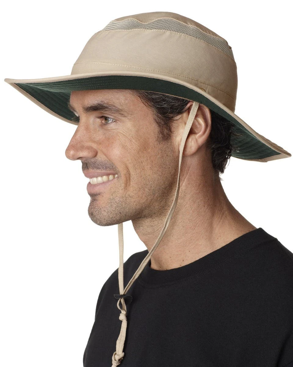 70% cotton, 30% polyester; UPF 45+ protection; Stain-resistant coating; Wide brim; Mesh ventilation insert in crown; Green under visor reduces glare; Adjustable chin strap with pull-up fabric chin lock; Interior self-adhesive closure pocket 4″w x 2″h imprint area