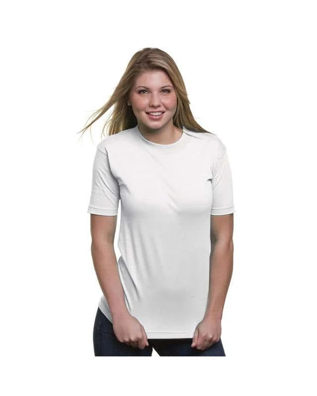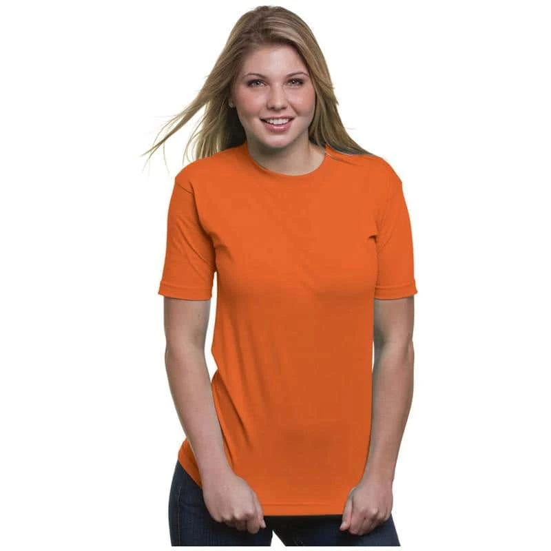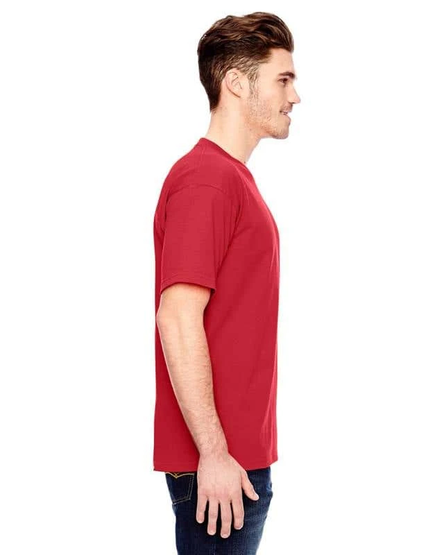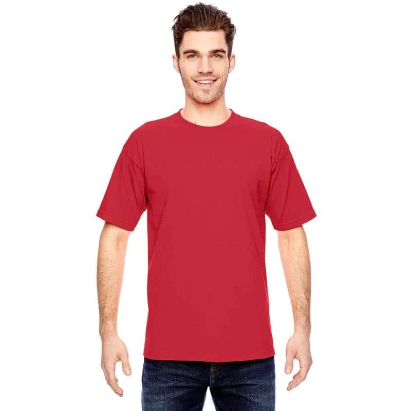 6.1 oz., 100% preshrunk cotton (blended cotton/polyester in heather colors); Open-end yarn; Full cut; Shoulder-to-shoulder taping; Double-needle sleeve and bottom hems; Union Made in the USA