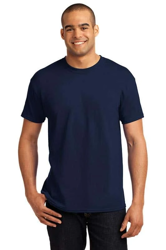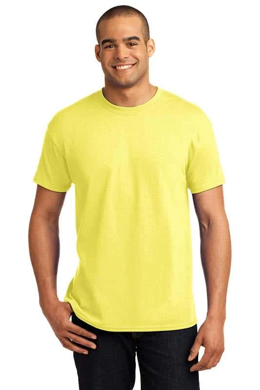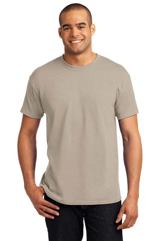 | 5.2-ounce, 50/50 cotton/poly Made with up to 5% recycled polyester Taped neck and shoulders Double-needle coverseamed crewneck Lay-flat collar Tear-away label Double-needle sleeves and hem Please note: This product is transitioning from tagged labels to tag-free and orders may contain a combination of both.