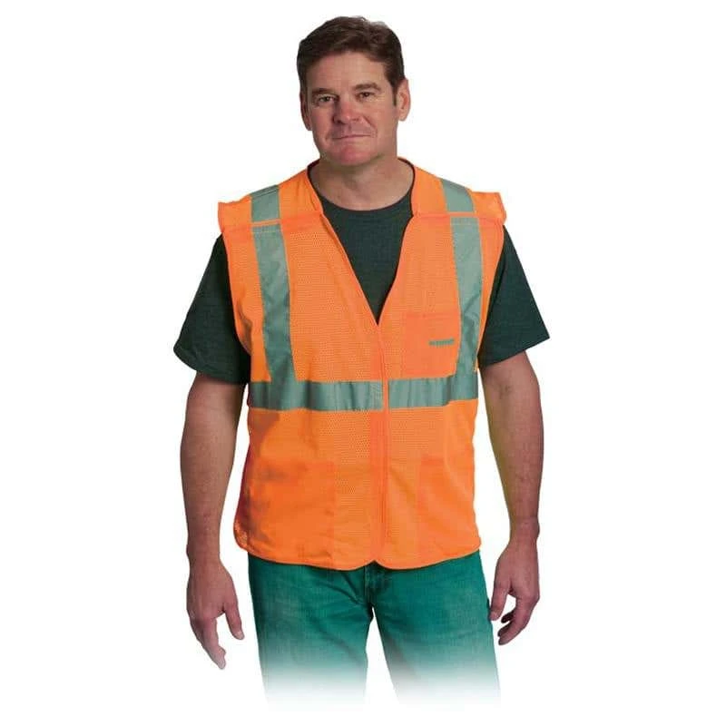 Featuring 2″ silver reflective tape for better visibility, hook and loop closure, 2 internal lower pocket and 1 external chest pocket with 1 pen pocket. , ANSI/ISEA 107 Class 2 vest , Made with a breathable, breakaway polyester mesh for maximum cool comfort and additional safety around moving machinery or equipment. , Sizing from Medium to 5X.,