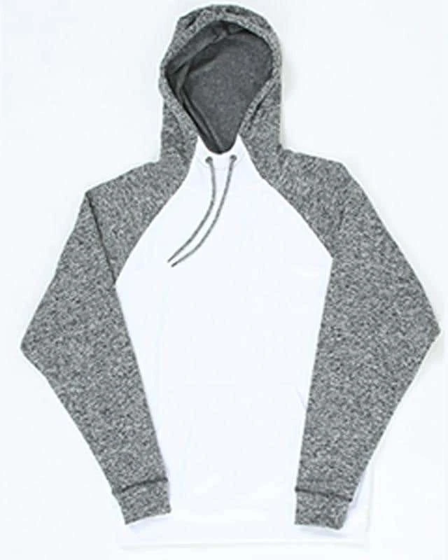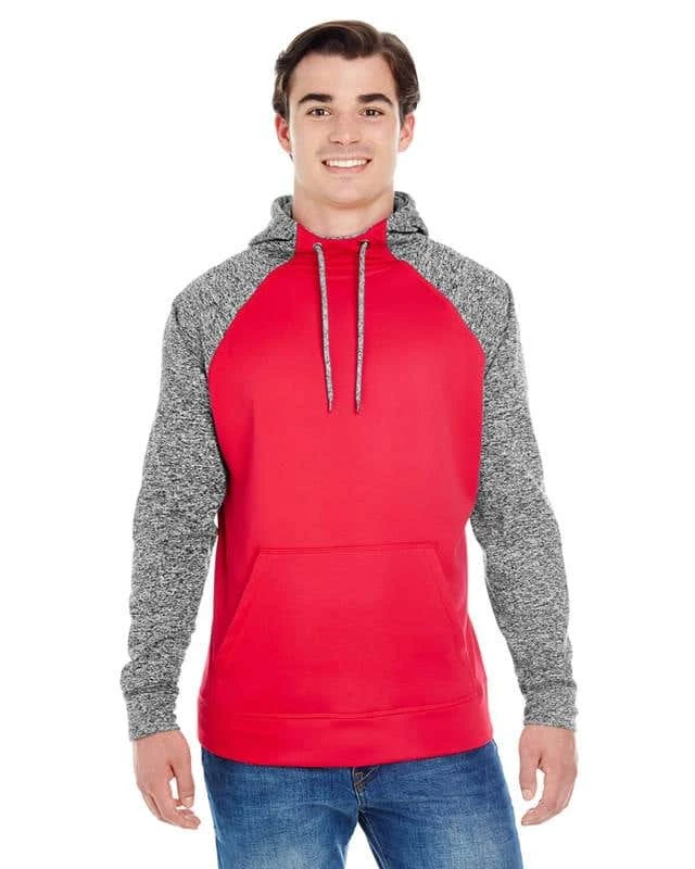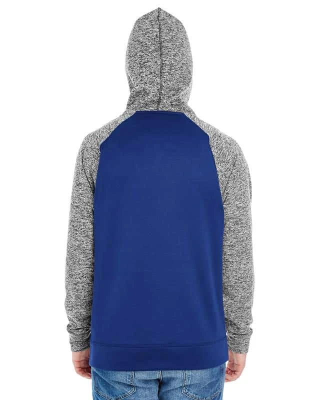 7 oz.; 100% spun polyester fleece fabric; Solid fleece body; Charcoal fleck sleeves and hood; High neckline; Front pouch pocket