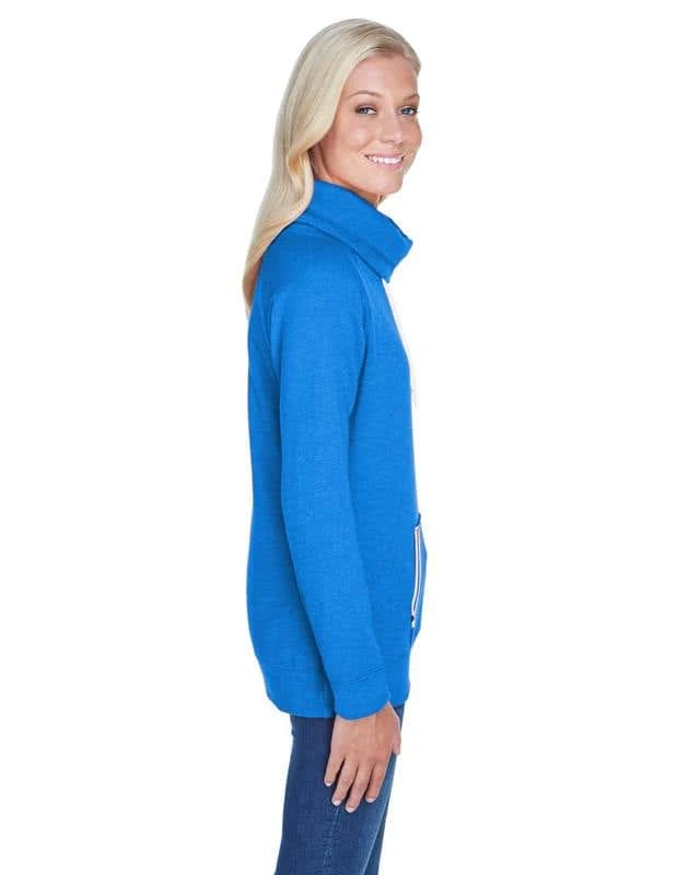 6.5 oz., 60% cotton, 40% polyester singledyed sueded fleece; 1×1 yarndyed stripe pocket trim; Self fabric cowl neck with off-white drawcords