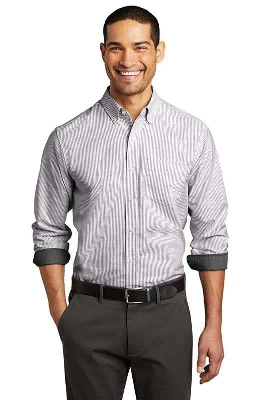 Our trusted SuperPro Oxford, with its wrinkle-free finish, now comes with a classic stripe design to keep you looking your professional best all day long. 4.6-ounce, 60/40 cotton/poly Wrinkle-resistant Stain-resistant Stain release Button-down collar Back shoulder pleats Left chest pocket Rounded adjustable cuffs Contrast fabric inside collar and under cuffs Contrast buttonholes on sleeve placket and cuffs