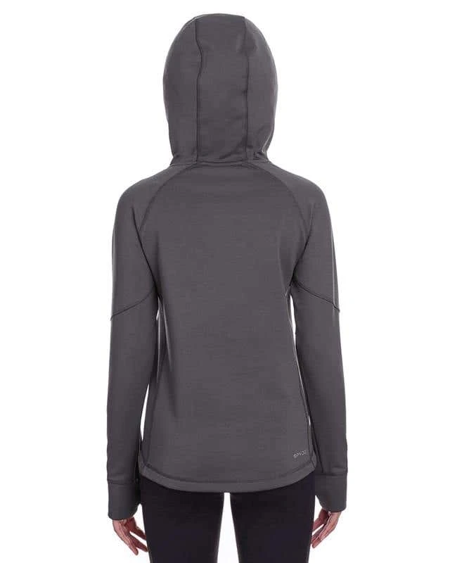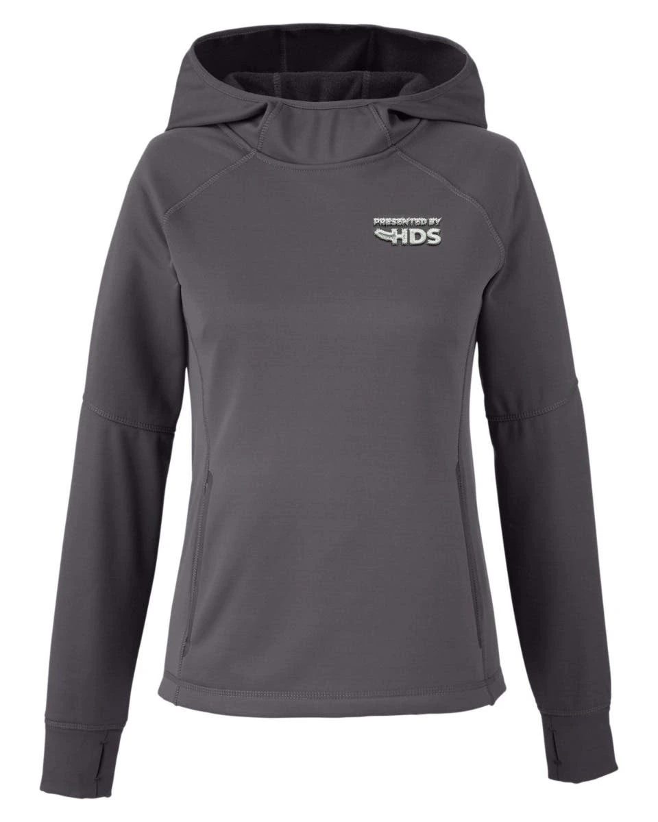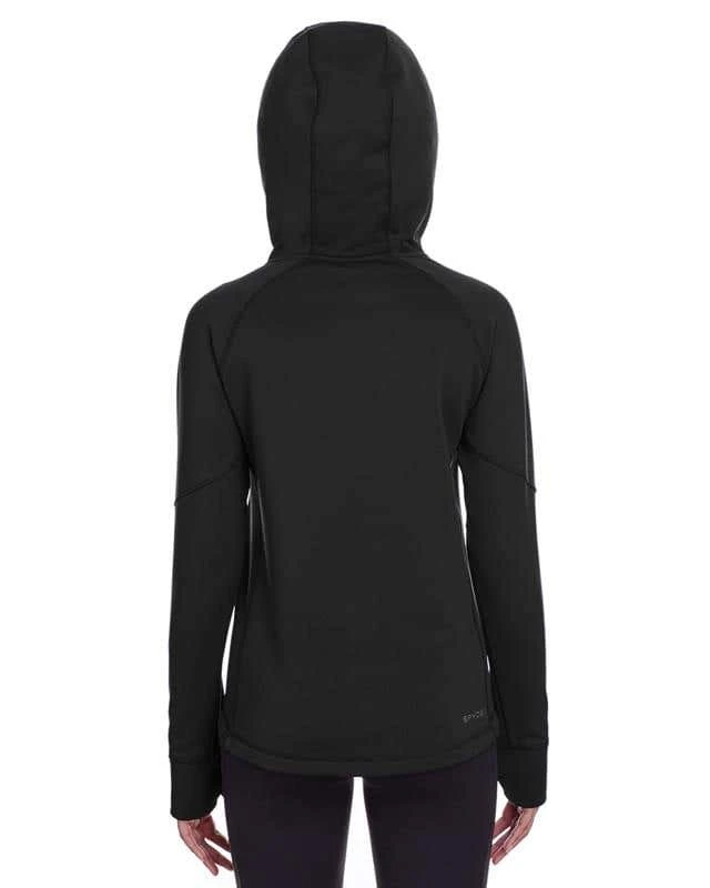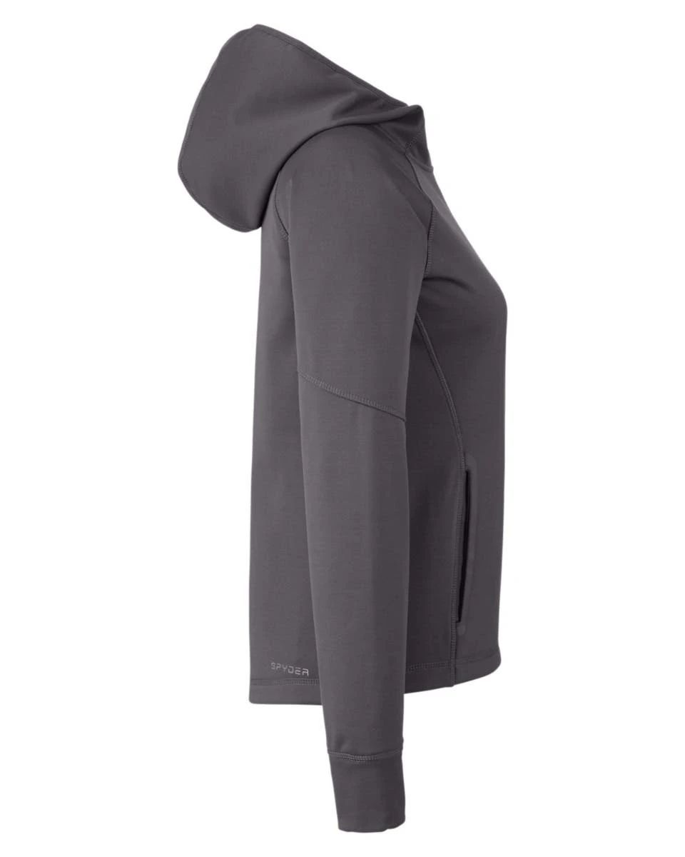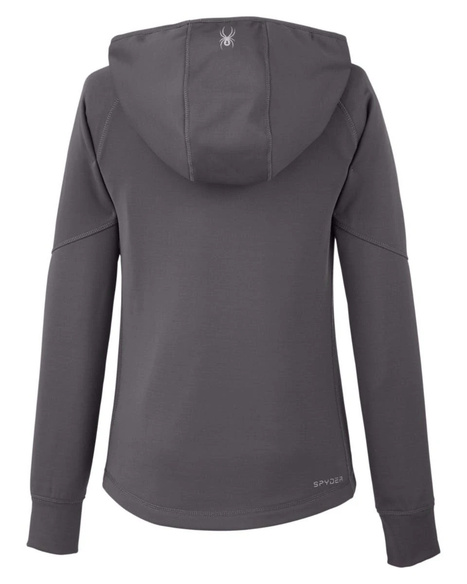 92% polyester / 8% spandex power fleece four way stretch fabric; thumb holes for comfort ; matte tape at pockets ; Spyder branding on back right hem