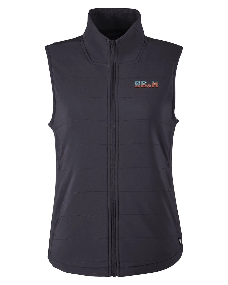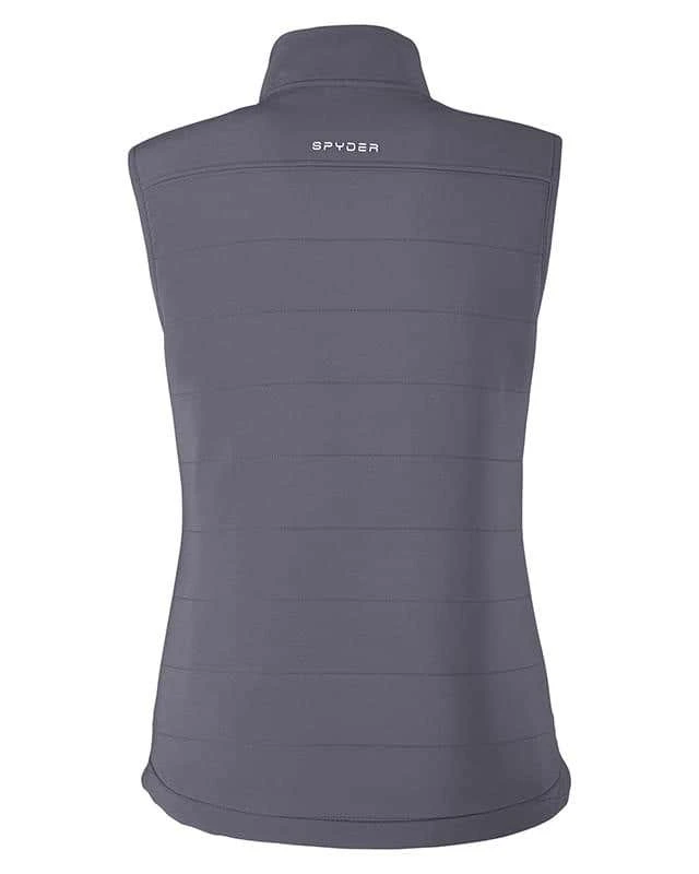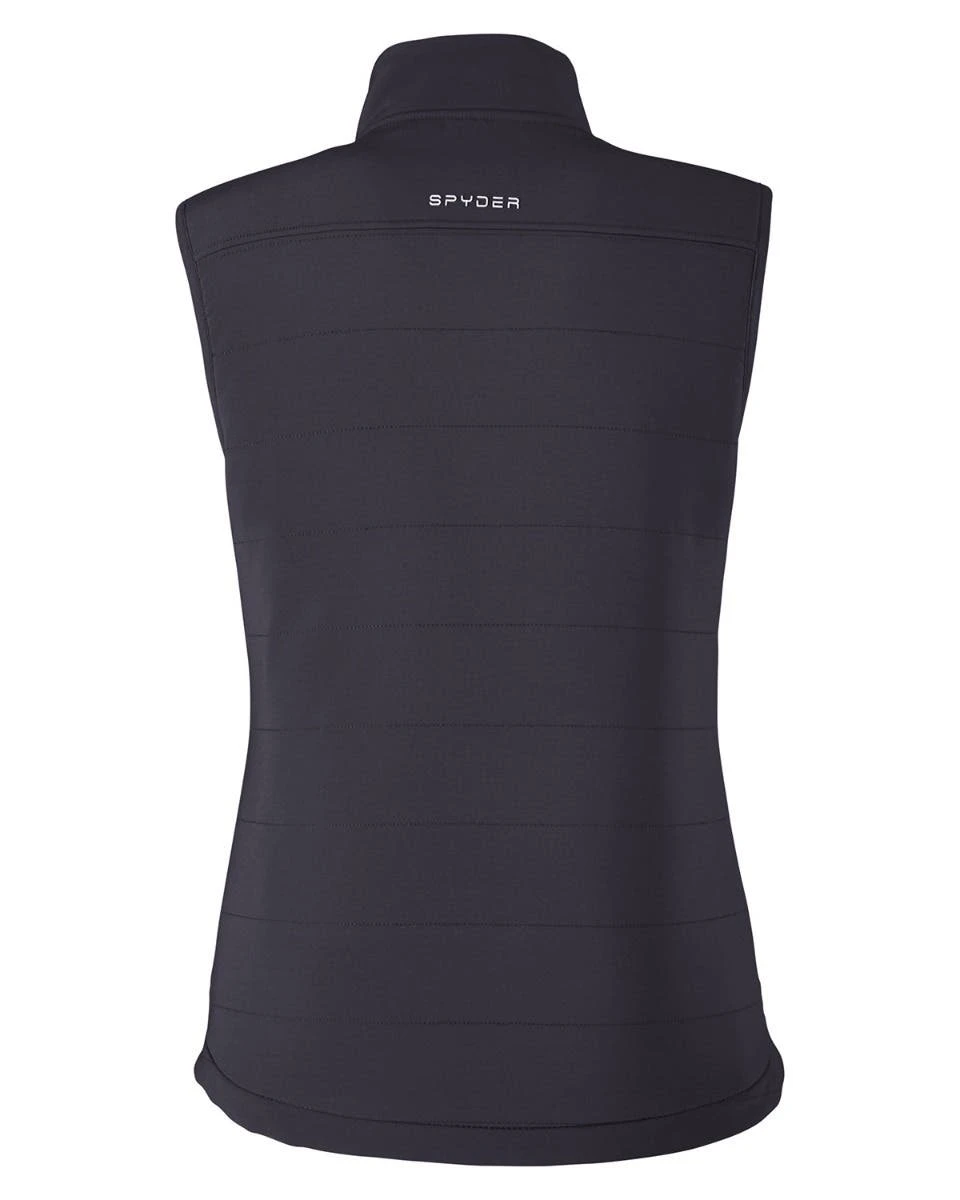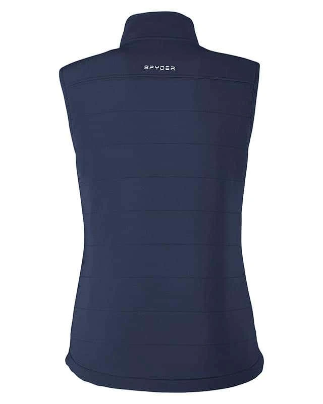 90% polyester, 10% Spandex; Pillow Tech quilted, three-layer fabric; Top Layer: lightweight, four-way stretch woven ; Insulation: warmth-retaining synthetic down; Base Layer: lightweight, four-way stretch woven; Quilting is 2.25″ apart; 4-way stretch yoke & side panels; Debossed spyder neck tape & internal locker loop; Reverse coil center front zipper w/ dye to match rubberized branded zipper pull; 1/2 inch welt side pockets w/ secure- zip closure & dye to match rubberized branded pulls; Stylized neck liine with brushed micro-denier tricot inner collar; Spyder branded label on lower front placket; Spyder bug woven loop label on wearers left chest pocket; Spyder wordmark rubberized screenprint on center back