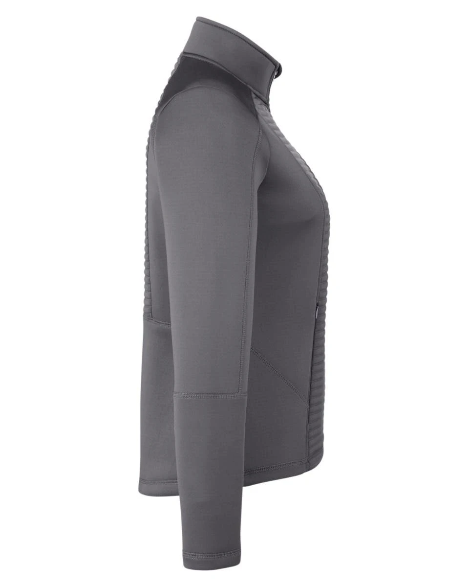 Fabric mix of neoprene and 100% polyester bonded knit with polyfill channels; princess seam details; iconic Spyder bug logo on front left; active fit ; dyed-to-match reflective tape at front zipper; zip closed front pockets