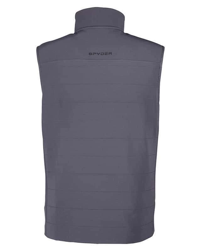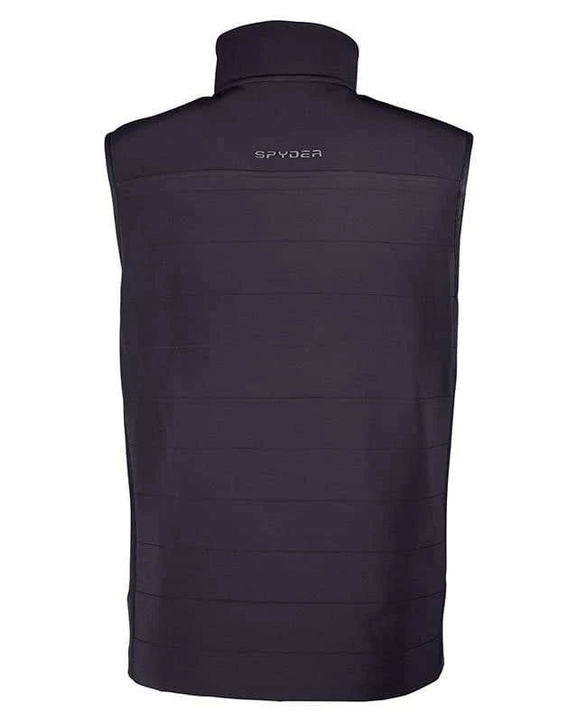 90% polyester, 10% Spandex; Pillow Tech quilted, three-layer fabric; Top Layer: lightweight, four-way stretch woven ; Insulation: warmth-retaining synthetic down; Base Layer: lightweight, four-way stretch woven; Quilting is 2.25″ apart; 4-way stretch yoke & side panels; Debossed spyder neck tape & internal locker loop; Reverse coil center front zipper w/ dye to match rubberized branded zipper pull; 1/2 inch welt side pockets w/ secure- zip closure & dye to match rubberized branded pulls; Stylized neck liine with brushed micro-denier tricot inner collar; Spyder branded label on lower front placket; Spyder bug woven loop label on wearers left chest pocket; Spyder wordmark rubberized screenprint on center back